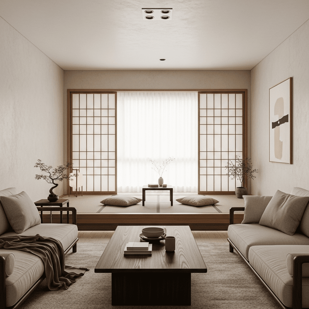Low furniture, natural materials, and a muted color palette create serene warmth. Incorporate shoji screens, floor cushions, and minimal decoration for peaceful simplicity.