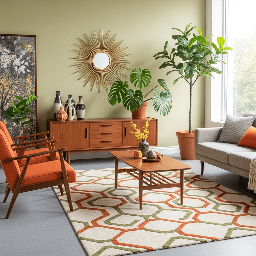 Classic mid-century furniture in warm wood tones pairs beautifully with contemporary comfort. Add texture through woven accents and keep the space uncluttered for that iconic retro appeal.