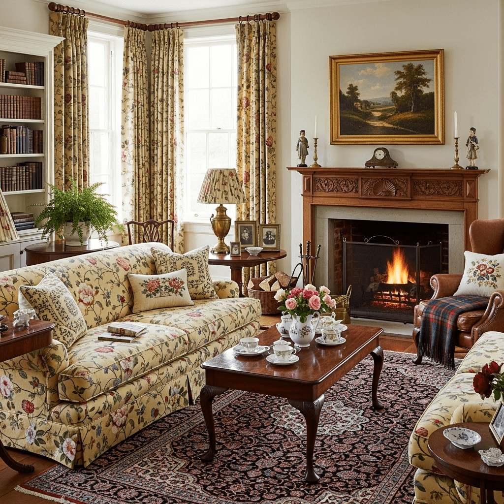 Floral chintz, deep sofas, and antique accents create quintessential English coziness. Layer patterns confidently and include plenty of seating for that lived-in, welcoming feeling.