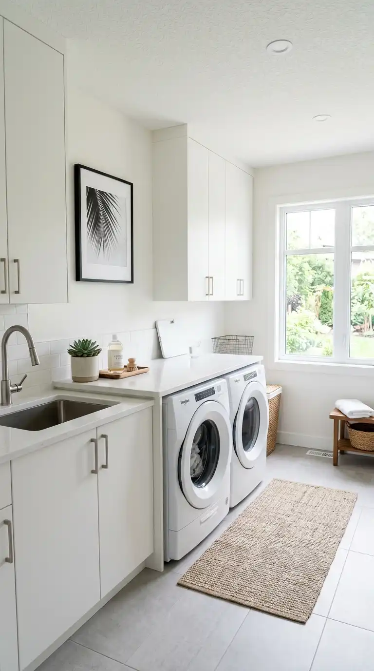 A minimalist laundry room emphasizes clean lines, a neutral color palette, and uncluttered surfaces. Use flat-panel cabinets in white or light gray, and a quartz or solid surface countertop. Choose a front-loading washer and dryer in matching finishes. Keep counters clear of clutter by storing supplies in pull-out drawers or behind closed doors. Add a single piece of wall art or a small plant for warmth.