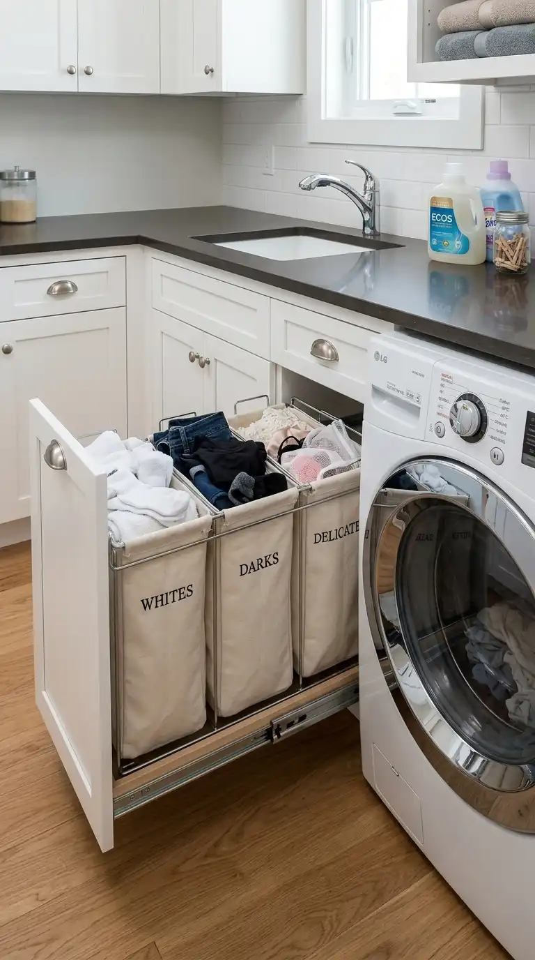 A built-in hamper keeps dirty laundry concealed and makes sorting easier. Install a pull-out or tilt-out hamper in your cabinetry, with two or three compartments for lights, darks, and delicates. Position the hamper directly beside or below the washer for easy loading. Use mesh bags or fabric liners for easy removal.