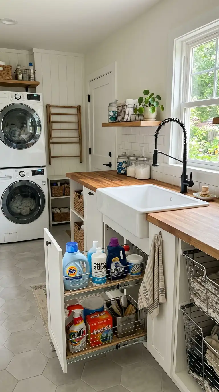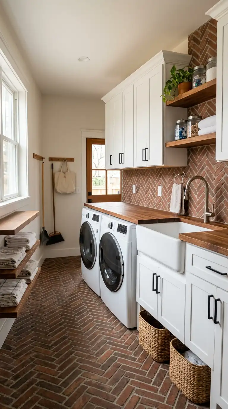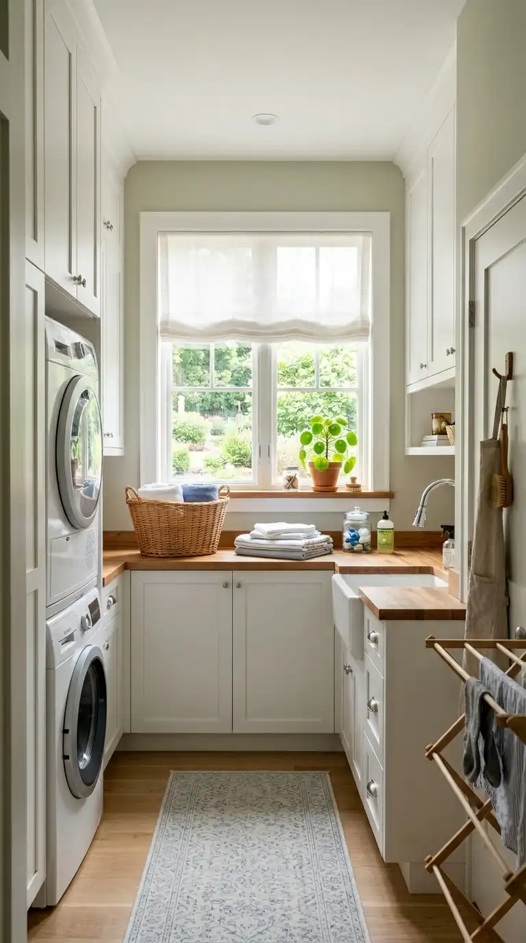 Create a warm, inviting laundry room with farmhouse charm. Use shaker-style cabinet doors, butcher block countertops, and a deep utility sink. Add open wooden shelves for displaying detergent in glass jars and folded white towels. Use a galvanized tub as a hamper and hang a clothesline with wooden clothespins for decor. A vintage rug and a sign reading “Laundry” complete the look.