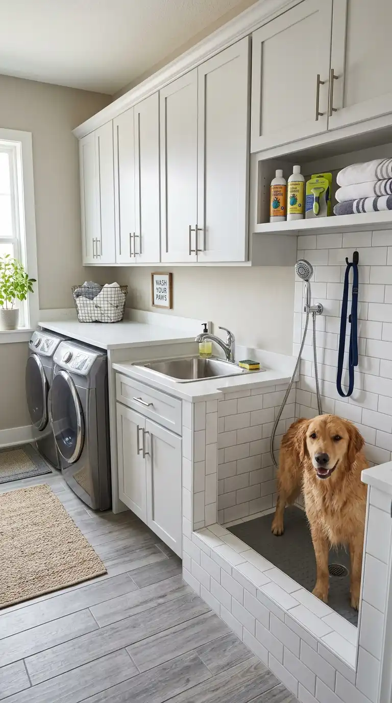If you have dogs, incorporate a pet washing station into your laundry room. Use a deep basin or a low-threshold shower area with a handheld sprayer. Add non-slip matting and a hook for a leash. Store pet shampoo and towels in nearby cabinets. The laundry room is the perfect place to clean muddy paws after a walk.