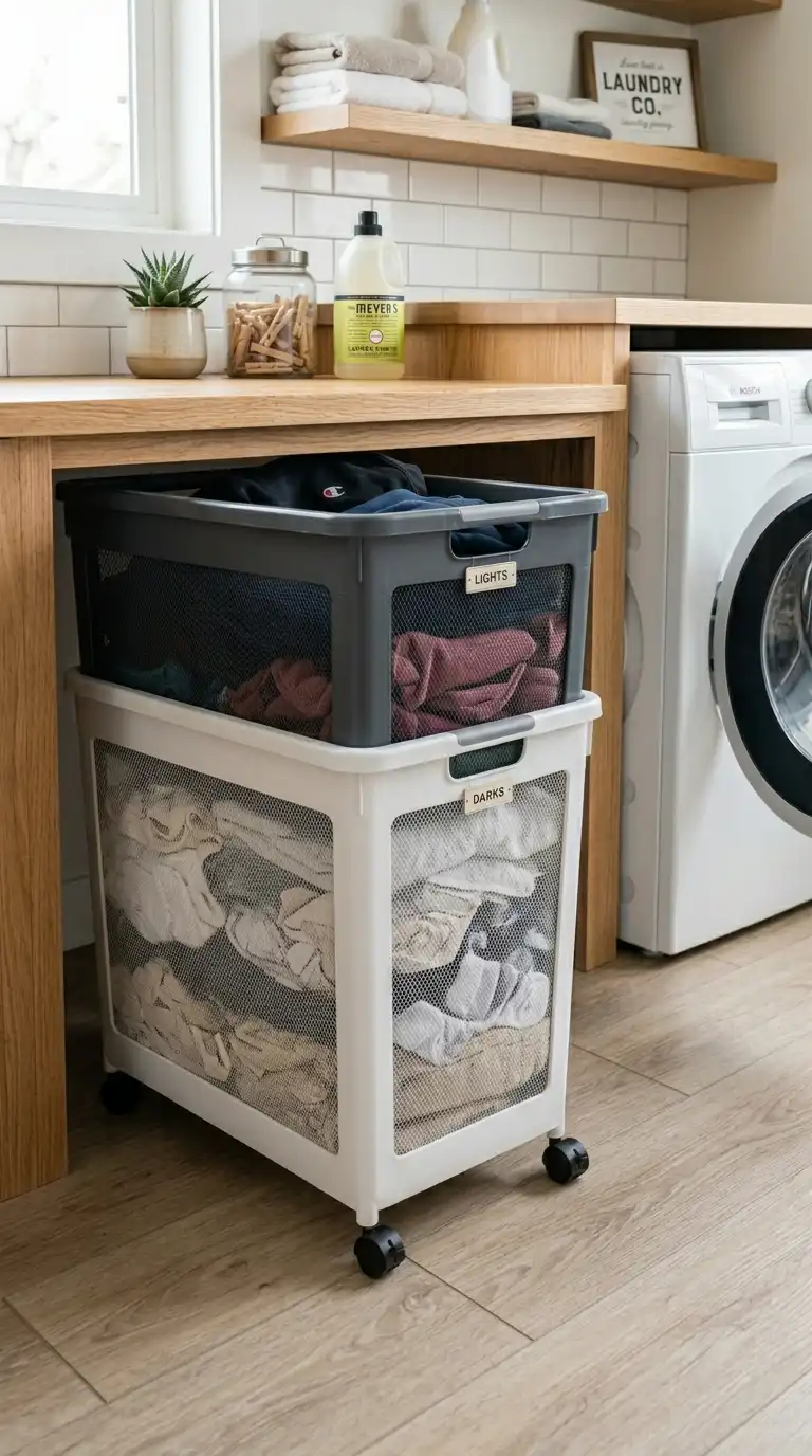 Rolling laundry baskets make it easy to transport clothes from room to room. Choose stackable baskets that fit under a counter or in a tall cabinet. When not in use, they roll out of the way. Use color-coded baskets for different types of laundry.