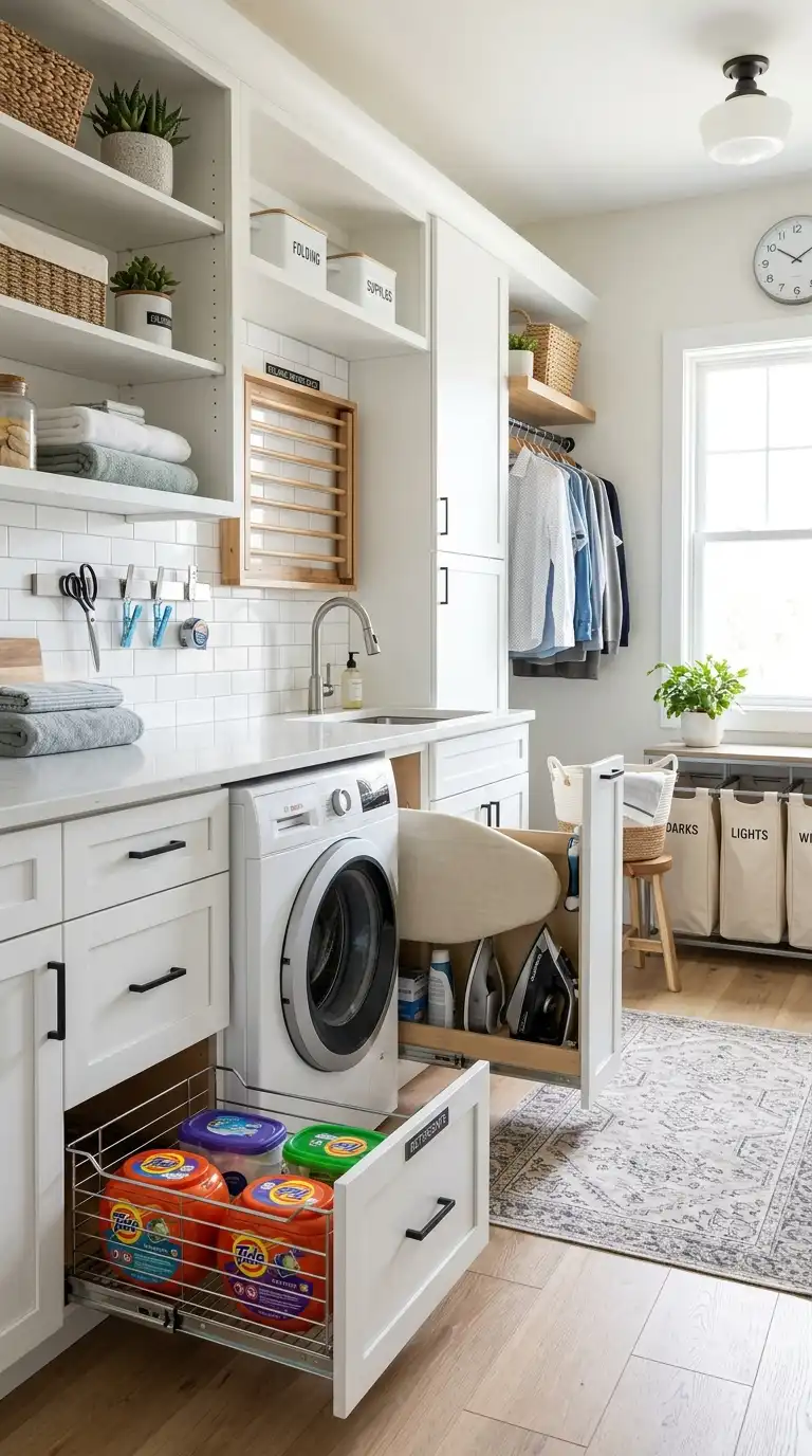 Incorporate clever storage solutions to keep every item in its place. Use pull-out wire baskets for detergent pods and dryer sheets. Install a wall-mounted drying rack that folds flat when not in use. Add a narrow pull-out cabinet for ironing board and iron. Use magnetic strips on the wall for holding small metal items like scissors and clips.