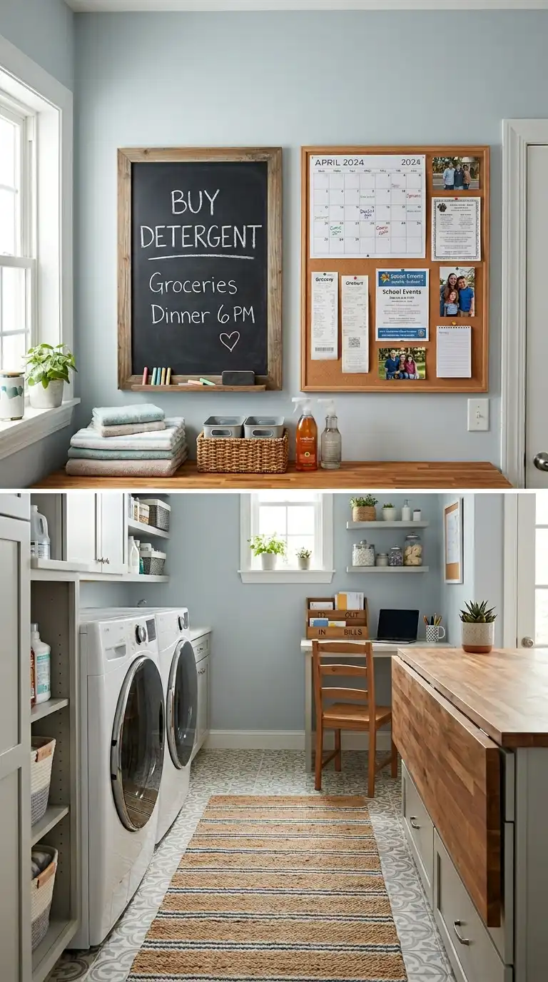 Turn your laundry room into a command center for household tasks. Install a chalkboard or whiteboard on the wall for leaving notes and grocery lists. Add a corkboard for pinning receipts and reminders. Use a small desk or counter space for sorting mail. This is especially useful for busy families.