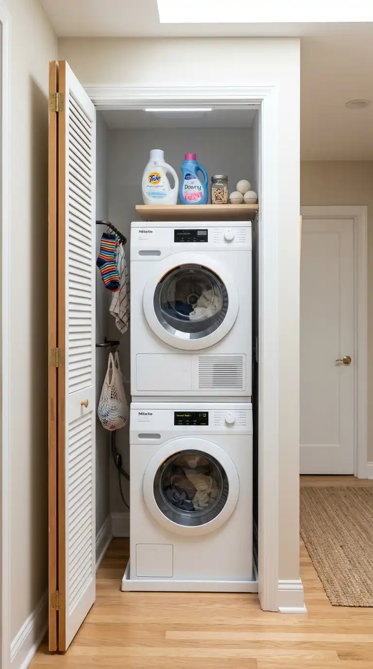 Convert a shallow closet into a functional laundry room. Stack a compact washer and dryer unit, or use a single combination washer-dryer. Install a folding door or a curtain to hide the machines when not in use. Add a narrow shelf above for supplies and a small rod for hanging delicates.