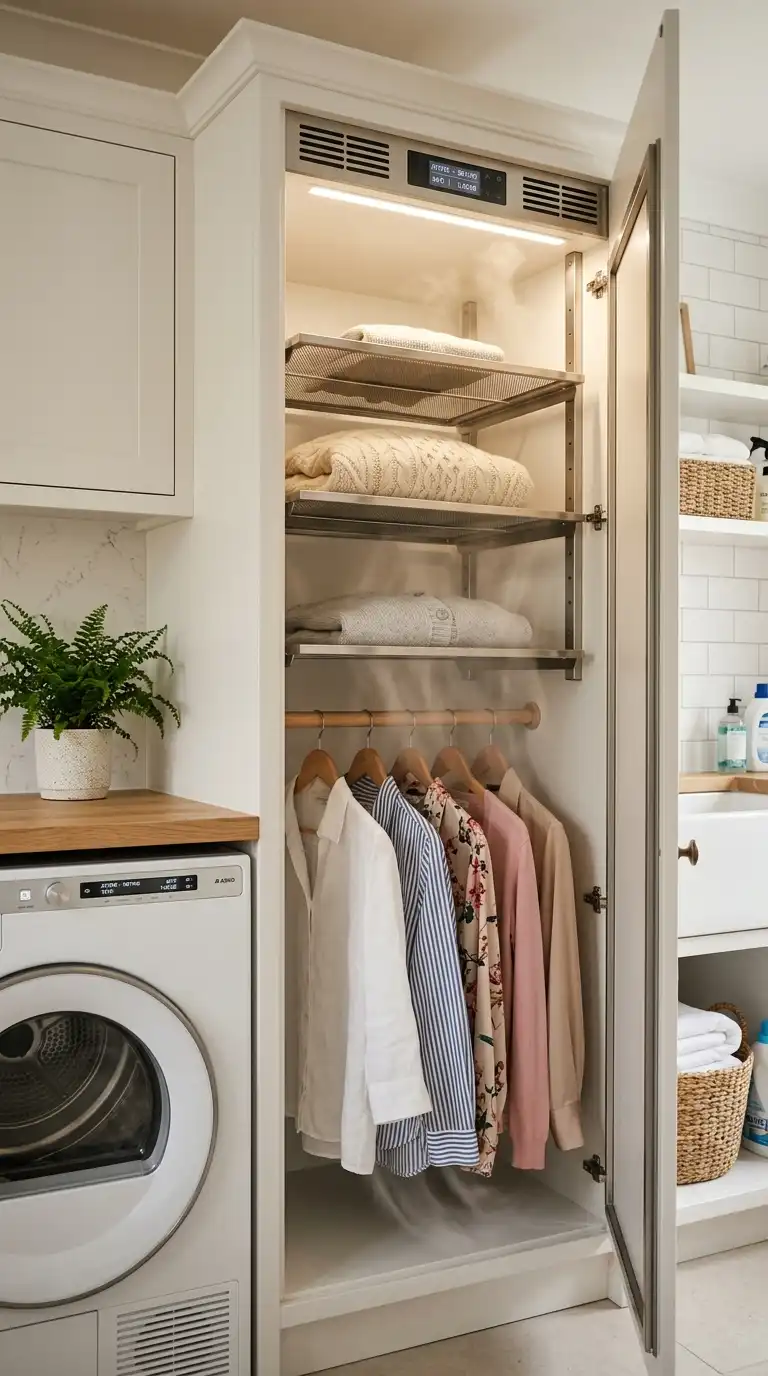 A drying cabinet is a luxury addition that gently dries delicate clothes, sweaters, and sneakers using warm air. The cabinet can be built into your cabinetry, with shelves and hanging rods inside. Use it for items that should never go in a mechanical dryer. Drying cabinets are energy-efficient and gentle on fabrics.