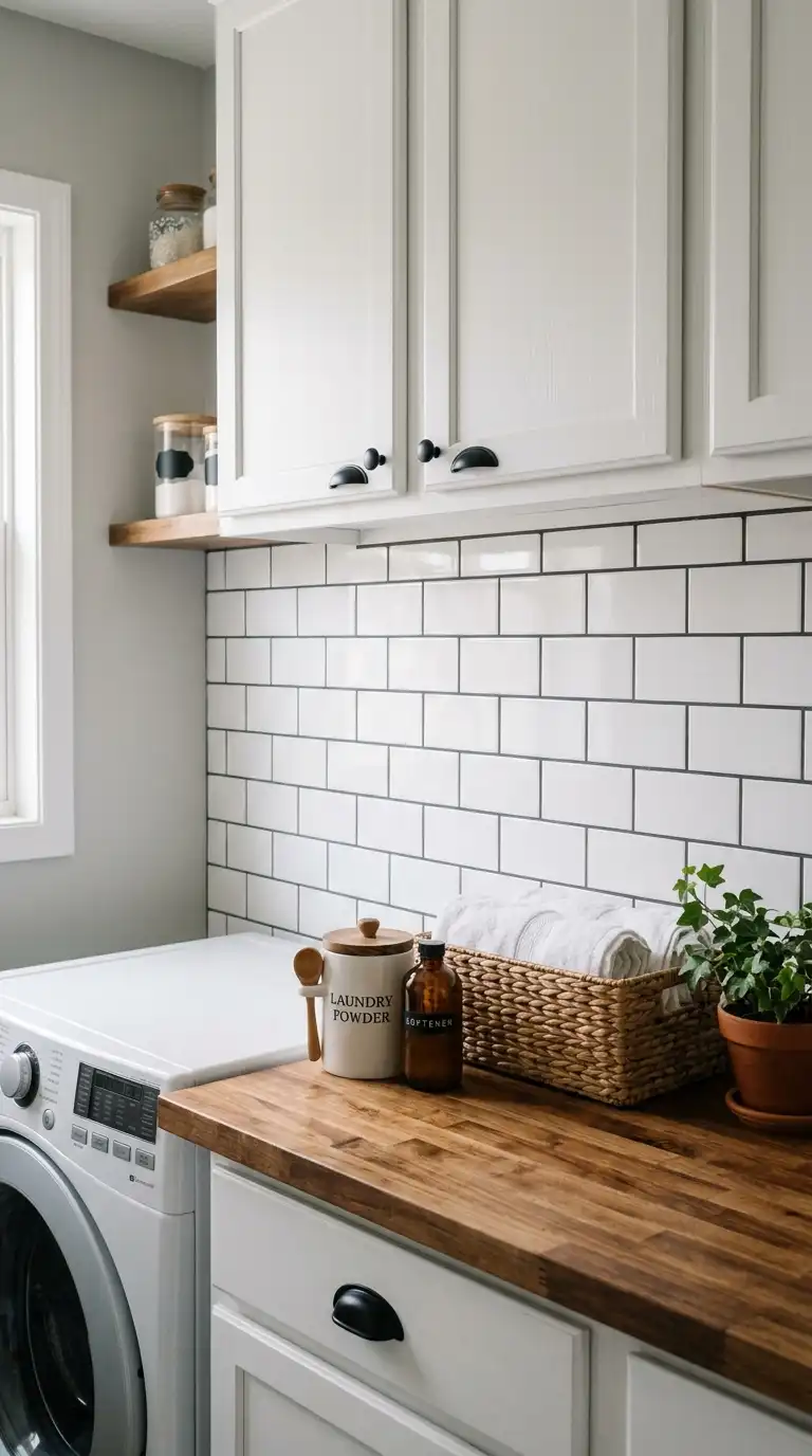 White subway tile is a timeless choice for a laundry room backsplash. It is bright, clean, and reflects light, making a small space feel larger. Use it behind the washer, dryer, and utility sink. Pair with white cabinets and a butcher block or quartz countertop. Use dark gray grout for contrast or white grout for a seamless look.