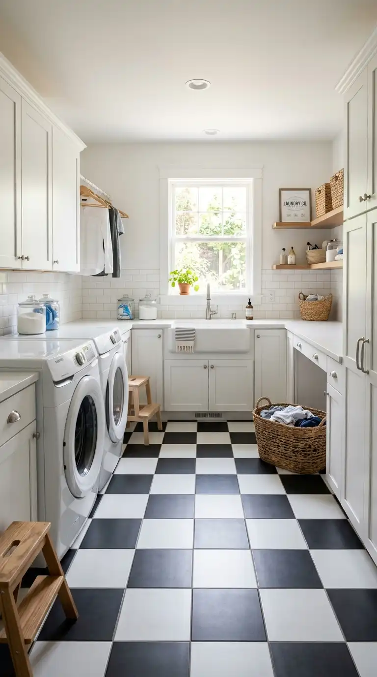 A black and white checkerboard floor is a vintage-inspired choice that adds drama and pattern to a laundry room. Use 12×12 or 6×6 tiles in a checkerboard pattern. The high contrast makes the floor a focal point. Keep the walls and cabinets light to balance the bold floor. This pattern works well in farmhouse, vintage, and traditional laundry rooms.