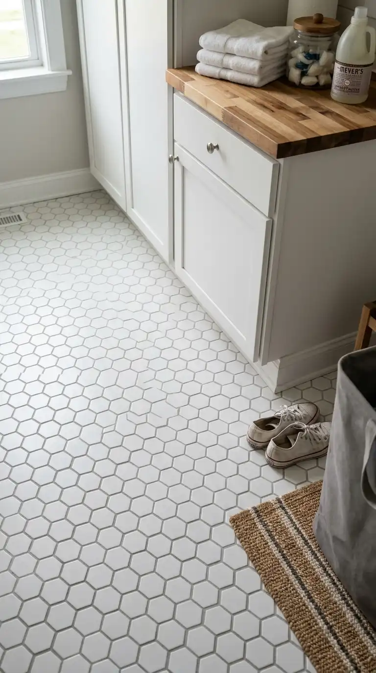 Hexagon tiles, also known as honeycomb tiles, add a soft, geometric pattern to a laundry room floor or backsplash. Use small hexagons for a classic look or large hexagons for a modern feel. Choose white, gray, or black tiles, or mix colors for a custom pattern. Hexagon tiles work well in both modern and traditional spaces.