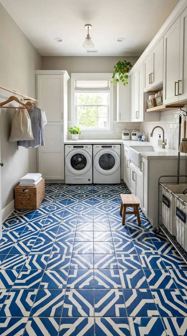 Blue patterned tile adds a fresh, coastal feel to a laundry room. Choose a pattern with navy, cobalt, or light blue tones. Use it on the floor or as a backsplash. Pair with white cabinets and natural wood accents. Blue tile works well in coastal, farmhouse, and cottage laundry rooms.