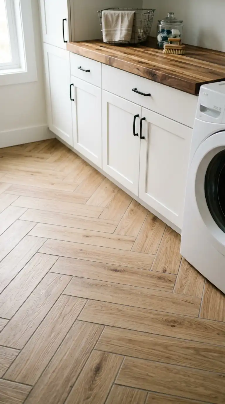 Wood-look porcelain tile gives you the warmth of wood with the durability and water resistance of tile. Install it in a herringbone pattern for added visual interest. Choose a light oak, medium walnut, or gray wood tone. Wood-look tile is perfect for laundry rooms where real wood might warp from moisture.