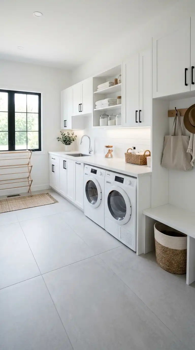 Large-format porcelain tiles (12×24 or larger) create a seamless, modern look with fewer grout lines. Use light gray, beige, or white tiles to make a small laundry room feel larger. The large scale is especially effective on floors. Use matching grout to minimize the appearance of grout lines.