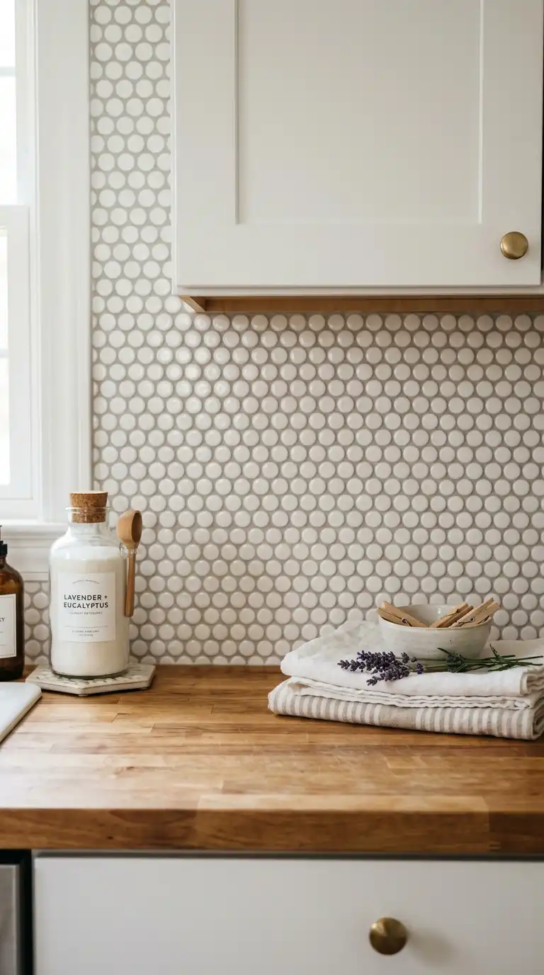 Penny round tiles are small, circular tiles that create a textured, playful surface. Use them on the floor or as a backsplash. Choose white or light gray for a subtle look, or mix colors for a polka dot effect. Penny tile is a vintage-inspired choice that works well in cottage and farmhouse laundry rooms.