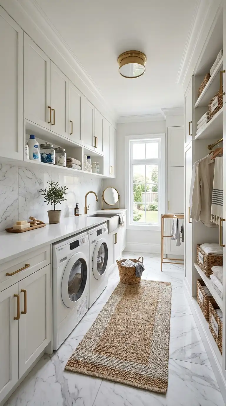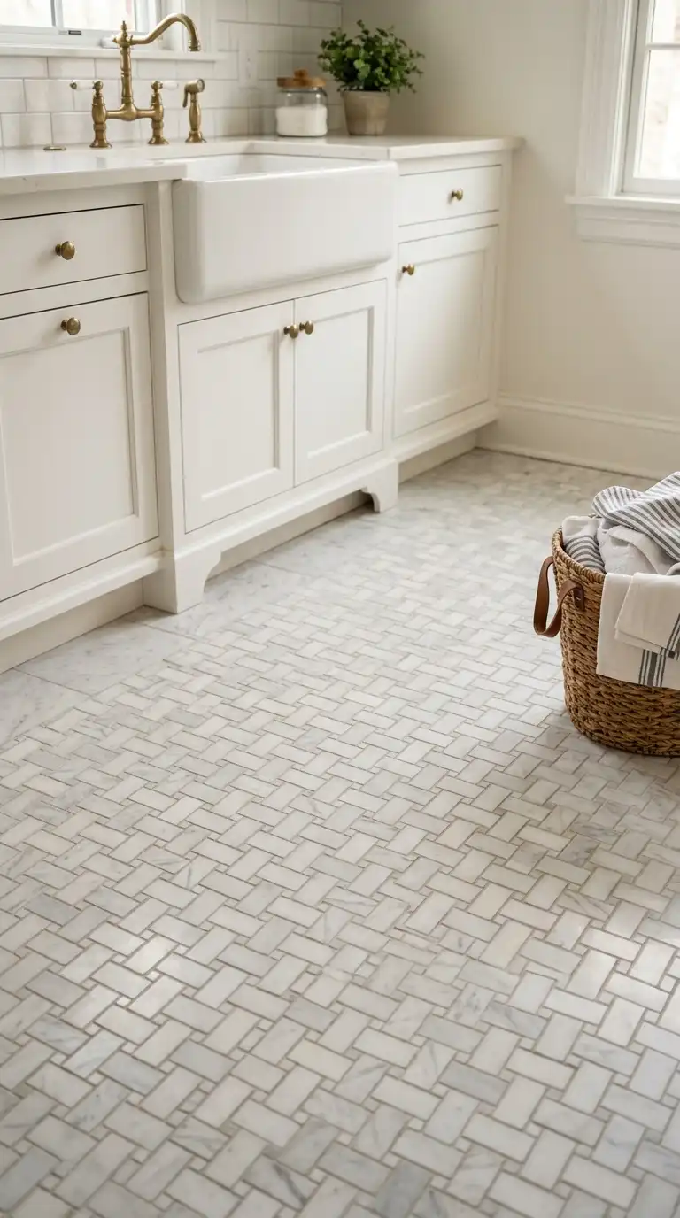 Basketweave marble tile is a classic, elegant choice for a laundry room floor. The pattern of small rectangular and square tiles creates a woven effect. Use white and light gray marble for a timeless look. Basketweave tile works well in traditional and vintage-inspired laundry rooms.