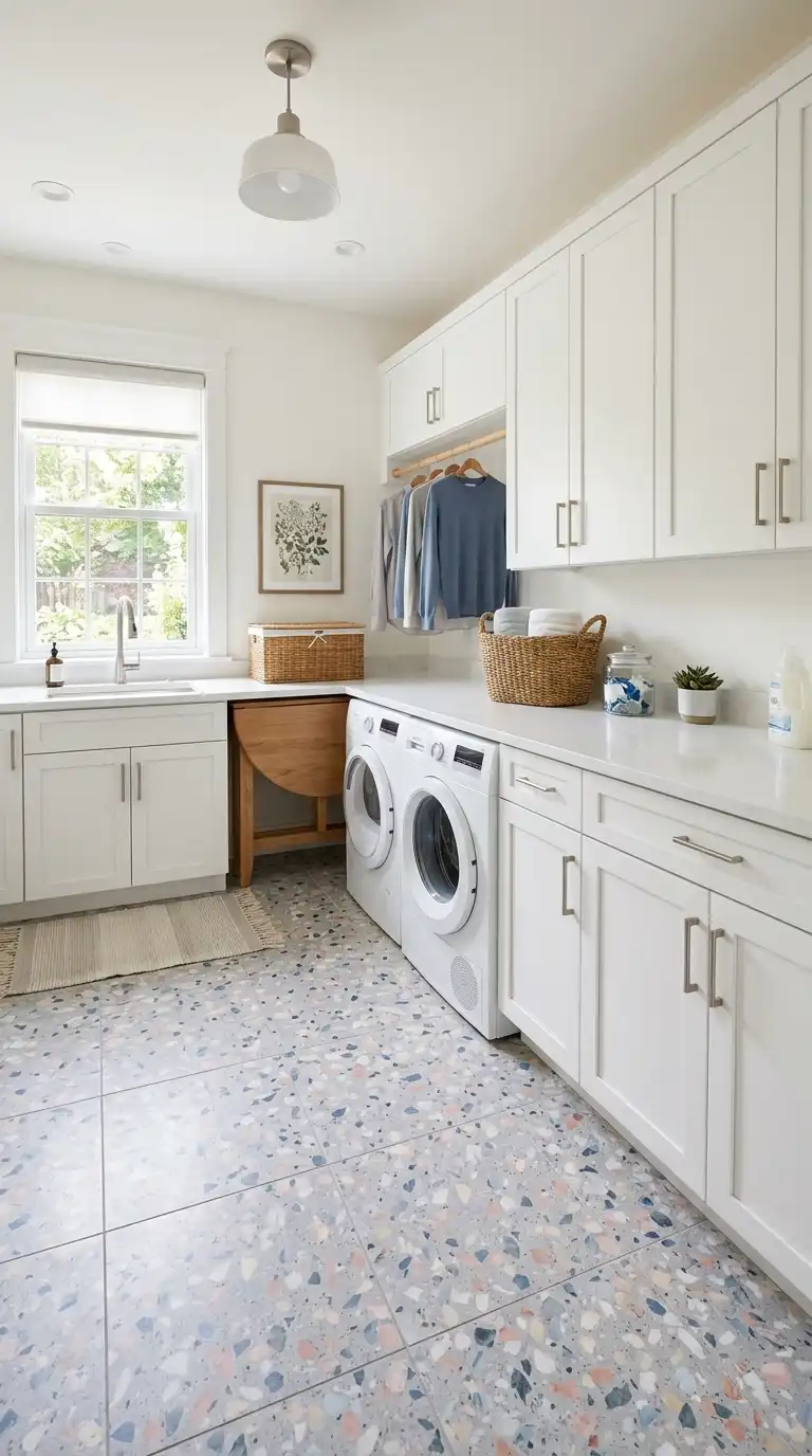 Terrazzo tile is a composite material made of chips of marble, quartz, or glass embedded in cement. It has a speckled, colorful appearance that adds personality to a laundry room. Choose a terrazzo with pastel chips for a soft look or bold colors for a statement. Terrazzo is durable and water-resistant.