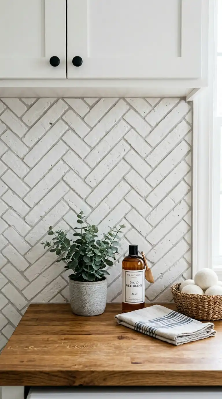 Herringbone brick tile adds texture and pattern to a laundry room backsplash. Use rectangular brick tiles arranged in a herringbone pattern. Choose white or cream bricks for a classic look, or terracotta for a rustic feel. The herringbone pattern adds visual interest and movement.