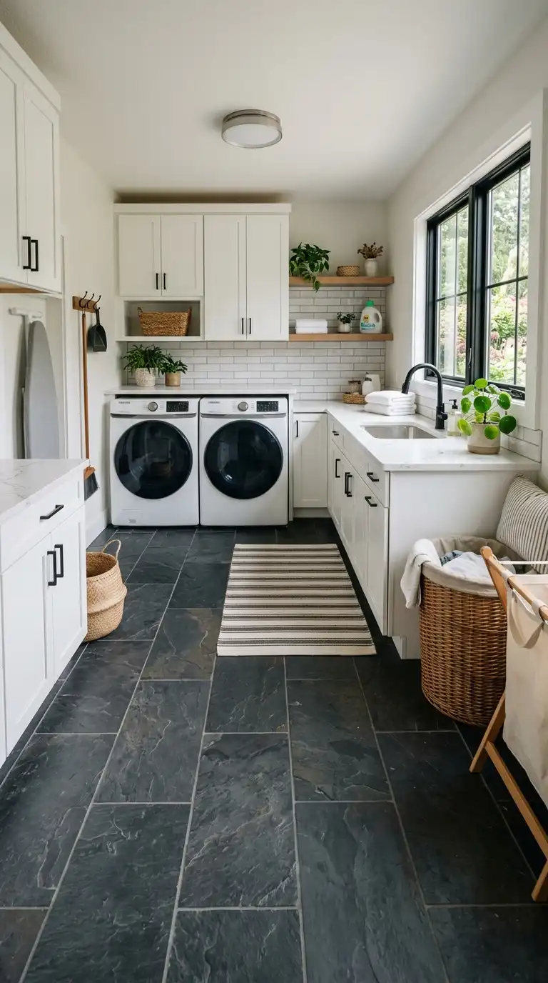 Slate tile is a natural stone with a dark, earthy appearance. It is durable, slip-resistant, and hides dirt well, making it practical for a laundry room. Use slate on the floor in charcoal, gray, or blue-gray tones. Pair with white or light gray cabinets to keep the room from feeling too dark.