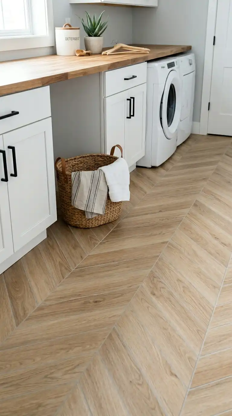 Chevron wood-look tile creates a dramatic, elegant pattern. Unlike herringbone, the ends of chevron tiles are cut at an angle to create a continuous V shape. Use light oak or gray wood-look tiles. The chevron pattern adds movement and sophistication to a laundry room floor.