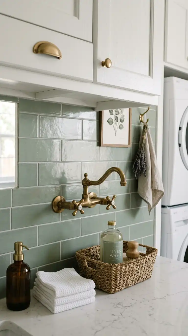 Green subway tile adds a fresh, calming color to a laundry room backsplash. Use sage green, mint, or emerald green tiles. Arrange them in a classic running bond pattern or stack them vertically for a modern look. Pair with white cabinets and brass hardware for a sophisticated palette.