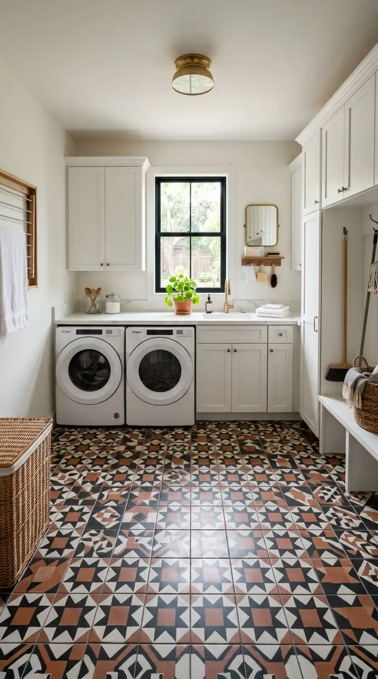 Patterned cement tile is a bold, artistic choice for a laundry room floor. Choose a pattern with geometric shapes, floral motifs, or abstract designs. Use colors that complement your cabinets and walls. Cement tile is durable and water-resistant but should be sealed to prevent staining. Keep the rest of the room simple to let the floor shine.