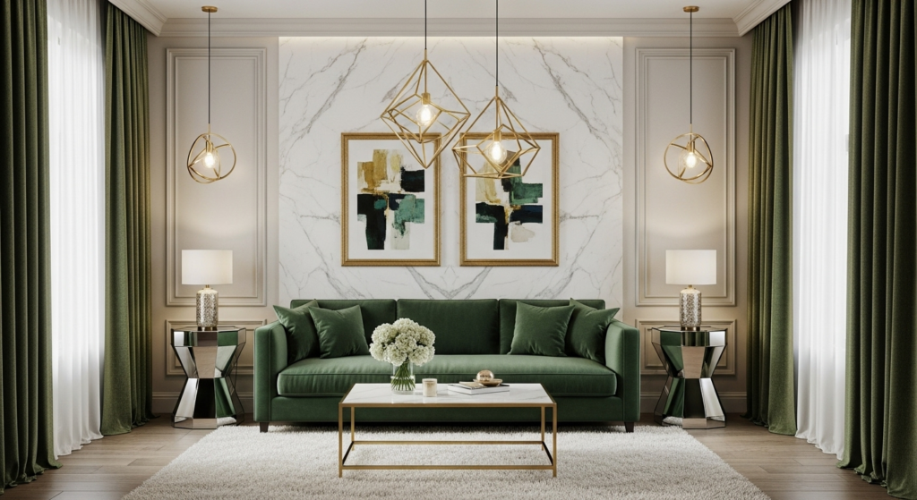 Create a sophisticated narrow living room with clean lines, rich materials, and a refined color palette. Velvet upholstery, metallic accents, marble surfaces, and statement lighting elevate the space. Keep furniture streamlined to maintain the elegant, uncluttered aesthetic.