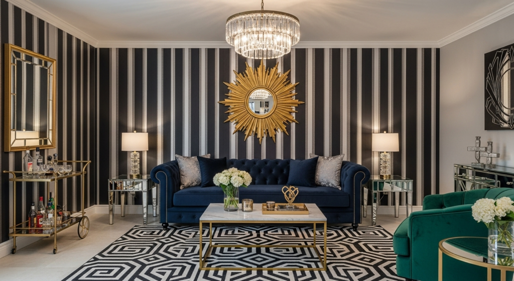 Bring 1920s elegance to your narrow space with geometric patterns, luxe materials, and bold contrasts. Art Deco’s vertical emphasis and dramatic styling can actually enhance a narrow room’s proportions. Use mirrors, gold accents, and jewel tones for maximum impact.