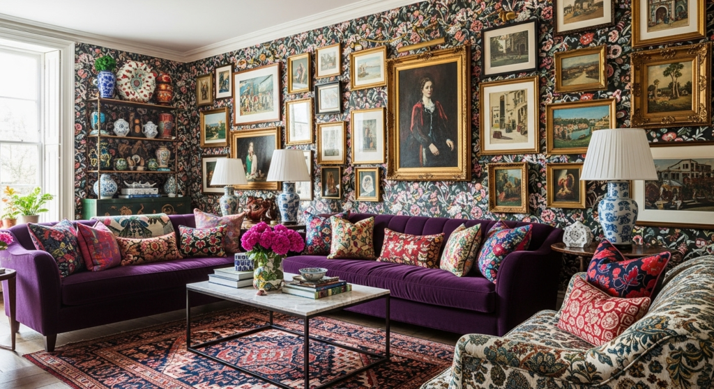 Embrace bold color, pattern mixing, and collected treasures for a personality-filled space. Maximalist style in narrow rooms requires careful curation—layer colors and patterns within a cohesive palette to create richness without chaos. Every surface tells a story.