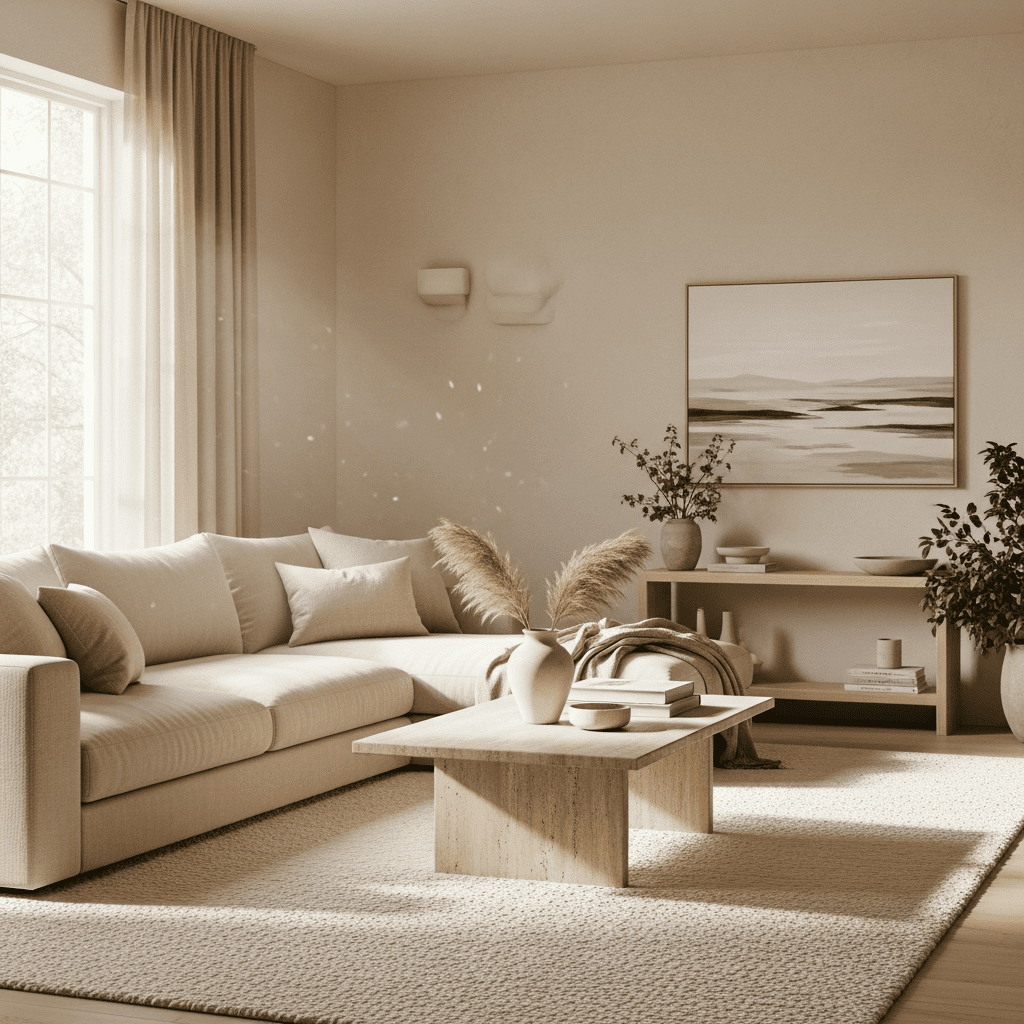 A layering of beige, cream, and sand tones using different textures like wool, linen, and matte stone to create depth without introducing contrasting colors.