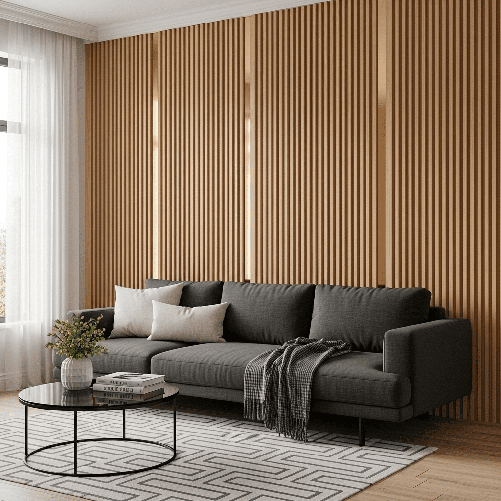 Focusing on vertical lines, this design features fluted wood wall panels accented by slim brass strips, creating a sophisticated backdrop for minimalist furniture.