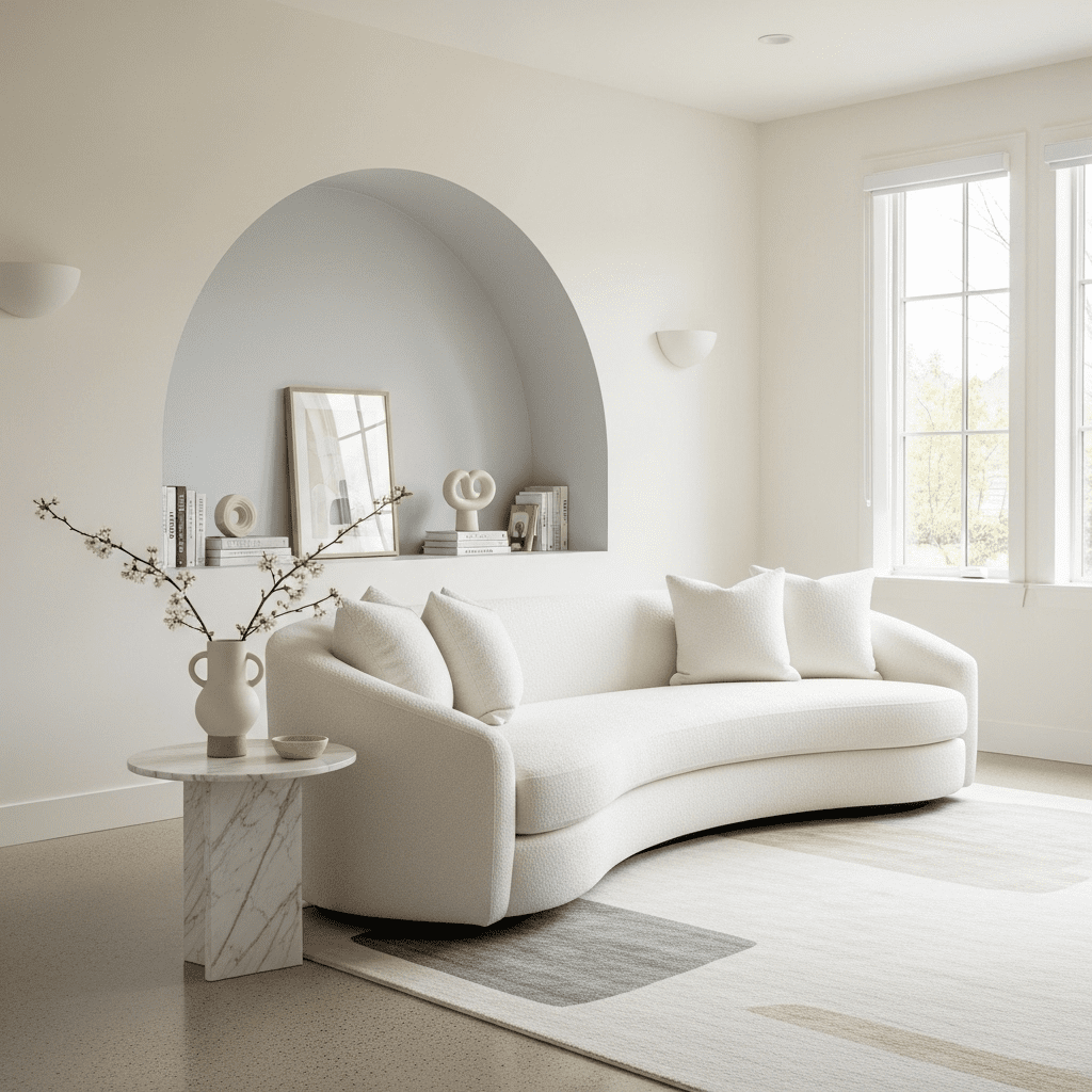 Moving away from rigid lines, this design features kidney-shaped sofas, circular ottomans, and arched doorways to create a sense of organic flow.