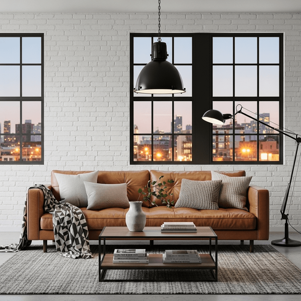 A refined take on industrial style, featuring exposed brick painted in white, black metal window frames, and plush leather seating to add comfort to the raw structure.