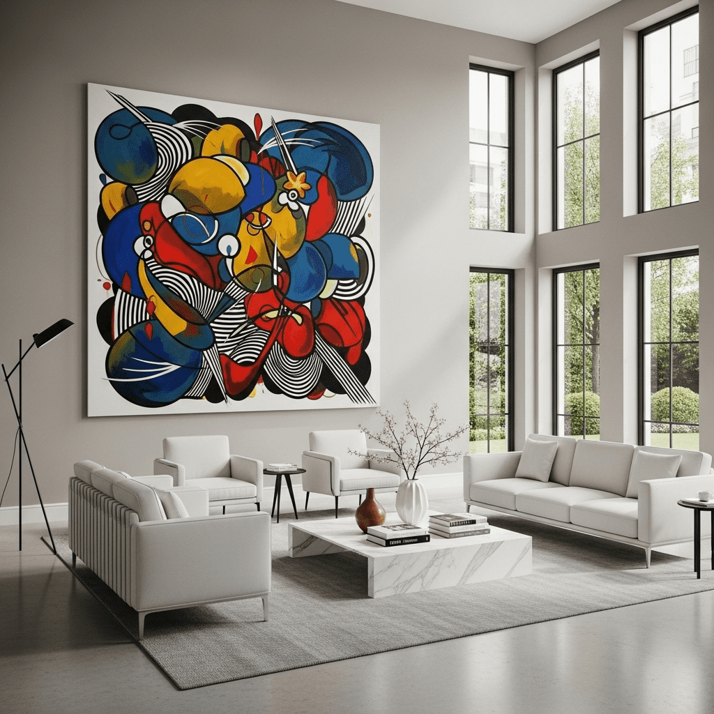 White-on-white walls and floors designed to showcase a single large-scale piece of modern art, with low-profile furniture that doesn’t obstruct the view.