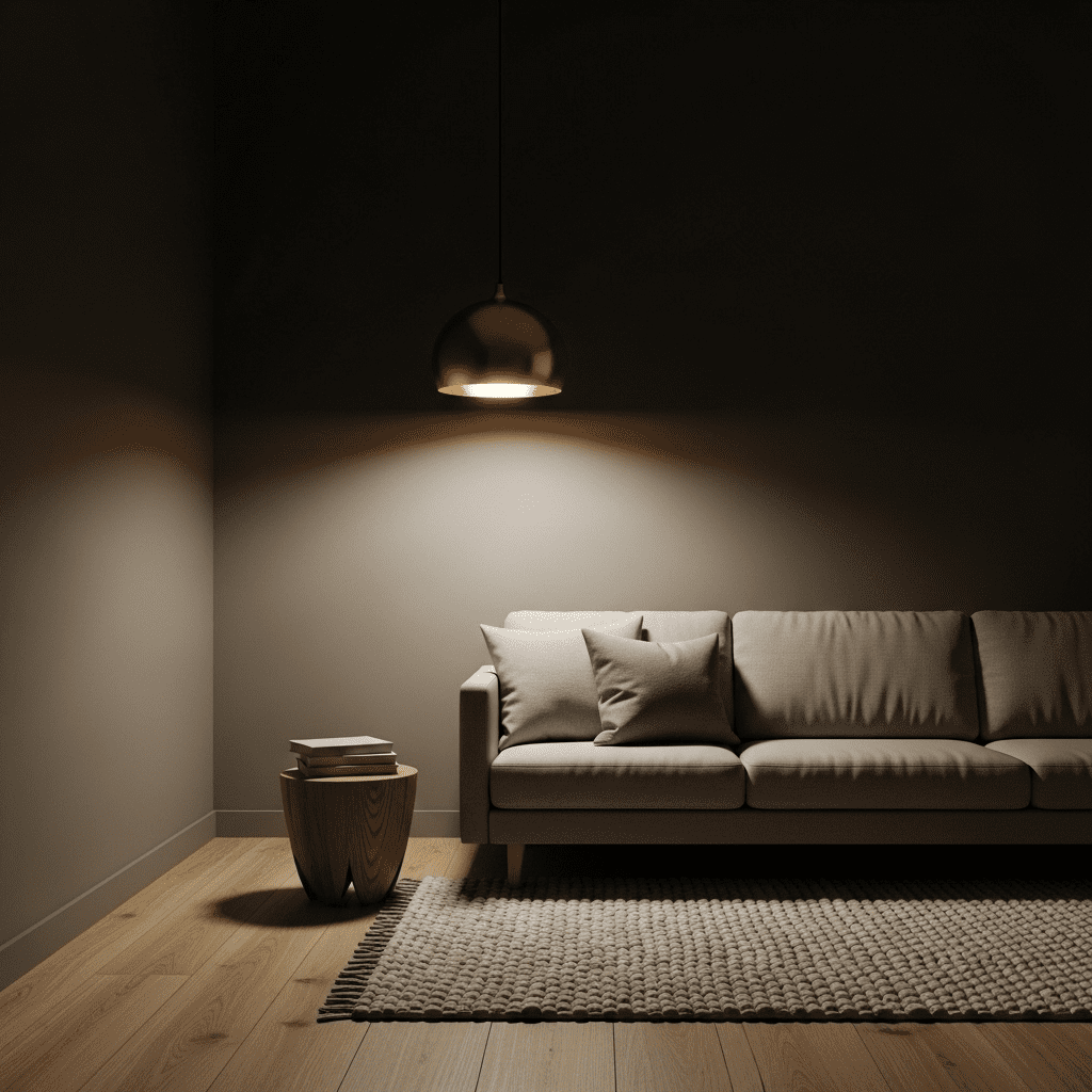 Deep charcoal or navy walls paired with light-colored flooring and metallic accents. This design creates an intimate, cocoon-like atmosphere.