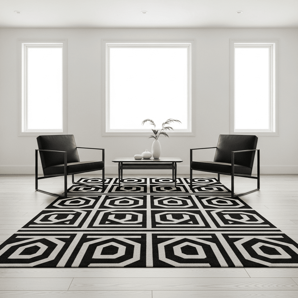 Utilizing sharp black and white contrasts in rugs, pillows, and art to create a high-energy, visually stimulating environment.
