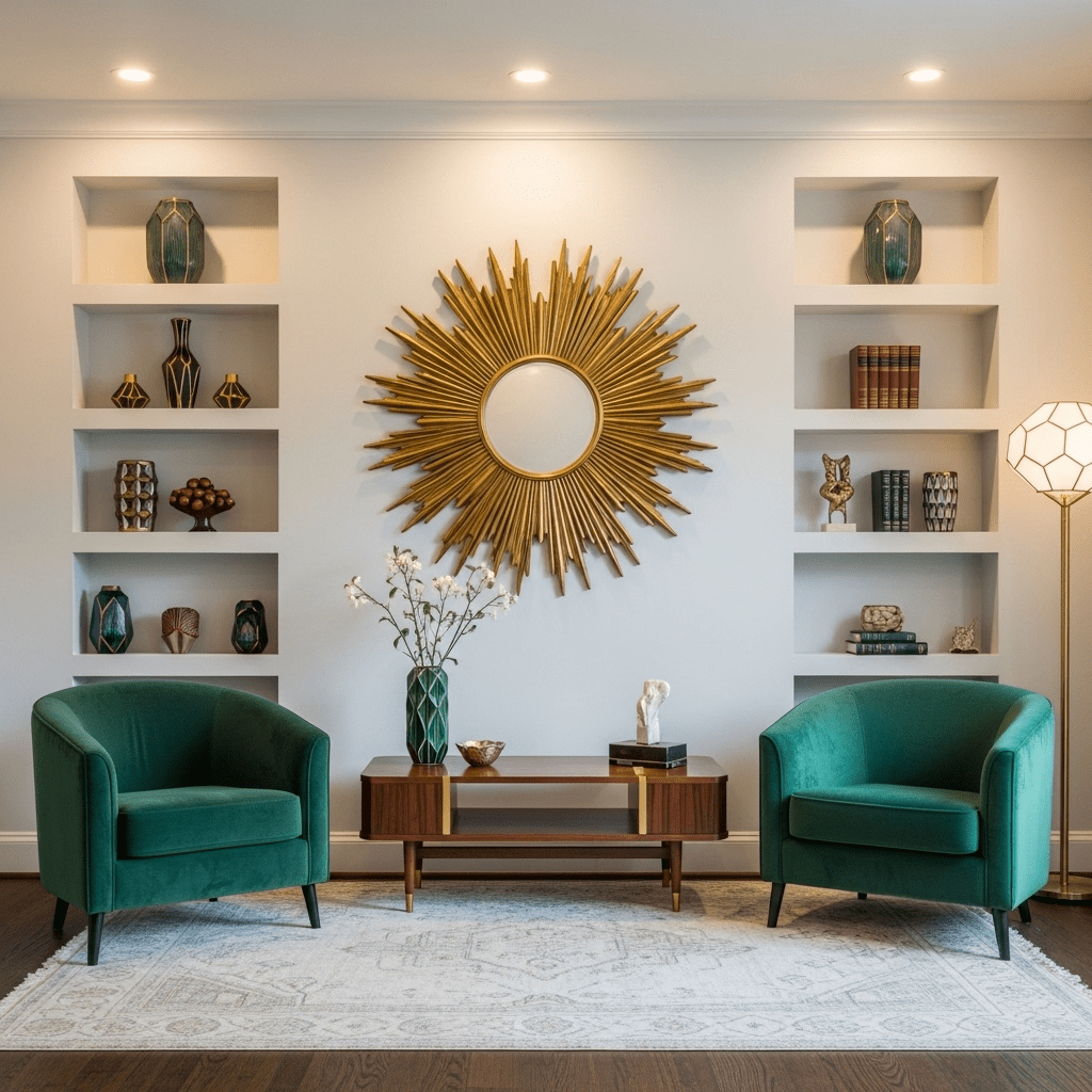 A contemporary spin on the 1920s, featuring bold arches, velvet upholstery in jewel tones, and symmetrical layouts.