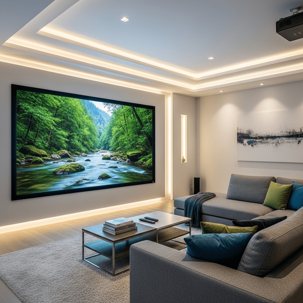 A design where technology is the star, featuring a seamless laser-projector setup and hidden speakers, all controlled by a central touch-panel.