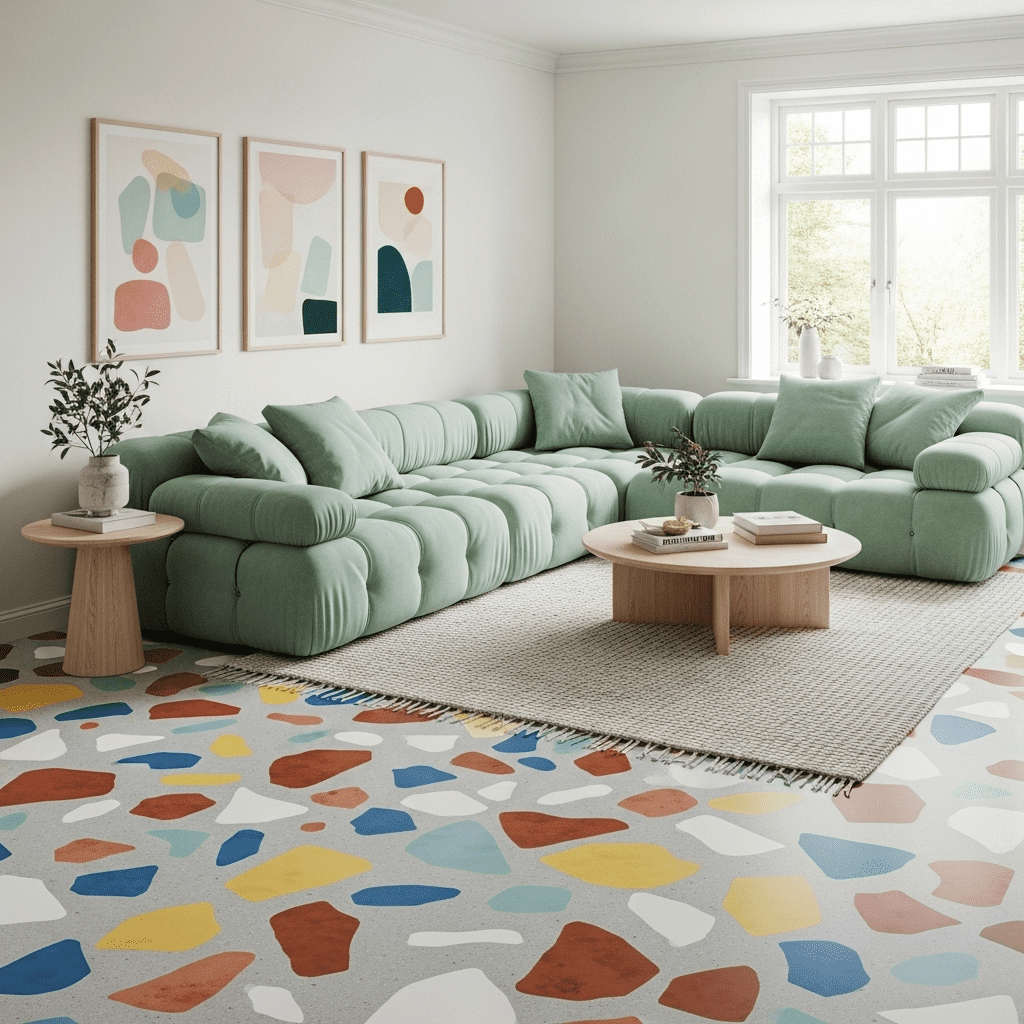 Playful and light, this design uses terrazzo stone flooring paired with soft pastel furniture in mint, blush, or lavender.