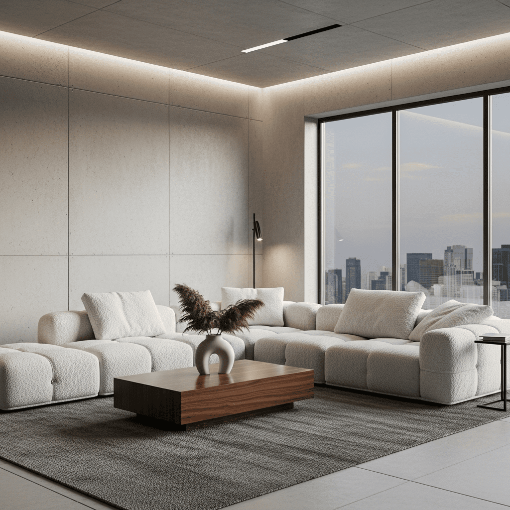 Raw concrete walls or floors balanced by extremely soft elements like oversized mohair throws and extra-deep, “sink-in” cushions.