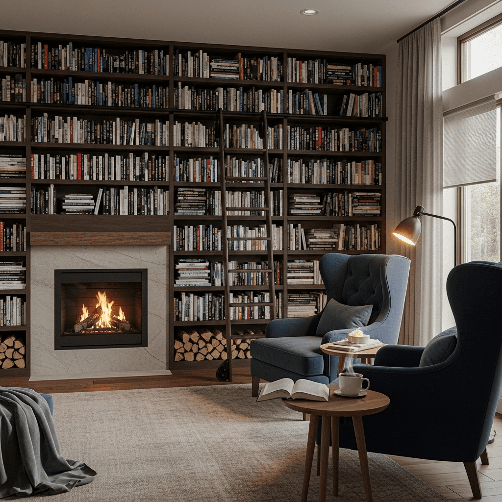 A room designed for quiet relaxation, featuring floor-to-ceiling bookshelves with an integrated rolling ladder and a pair of high-back reading chairs.