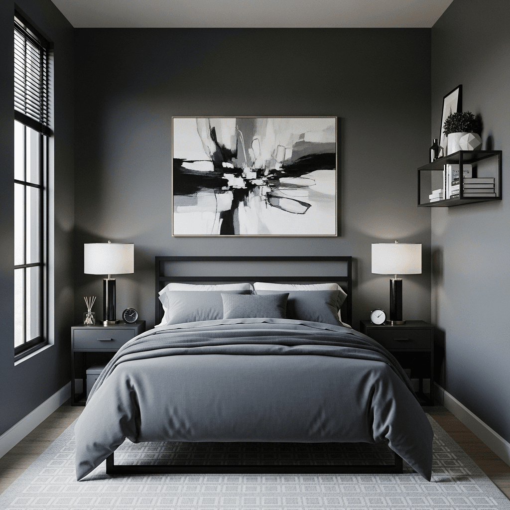 Modern bedroom ideas for small rooms men often utilize a dark, monochromatic palette. Using deep grays for both the walls and bedding creates a seamless, “boutique hotel” vibe that makes the corners of the room recede, adding a sense of depth.