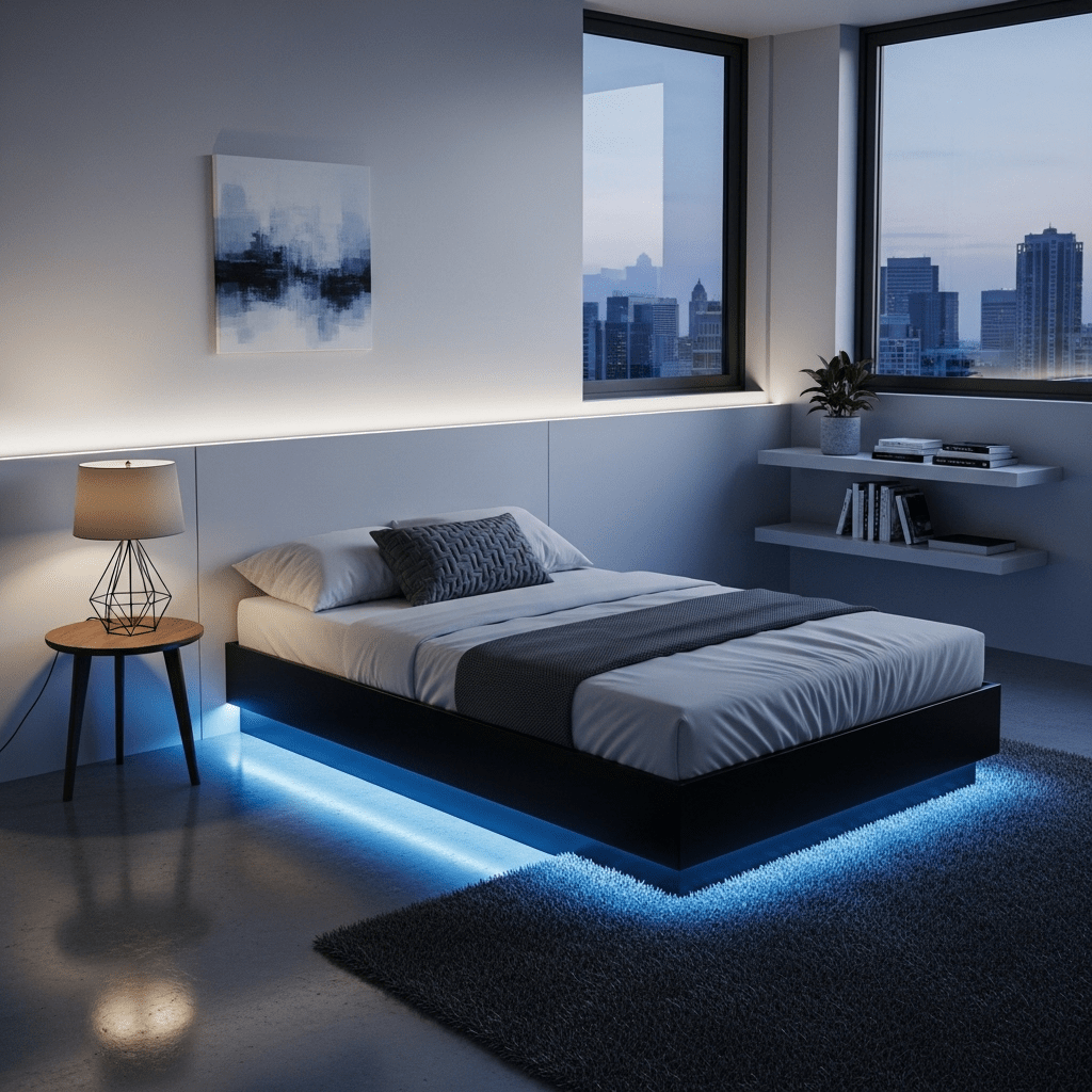 Modern bedroom ideas for small rooms men favor platform beds that sit nearly flush with the floor. Adding a hidden LED strip beneath the frame creates a “floating” effect, making the room feel more modern and spacious.