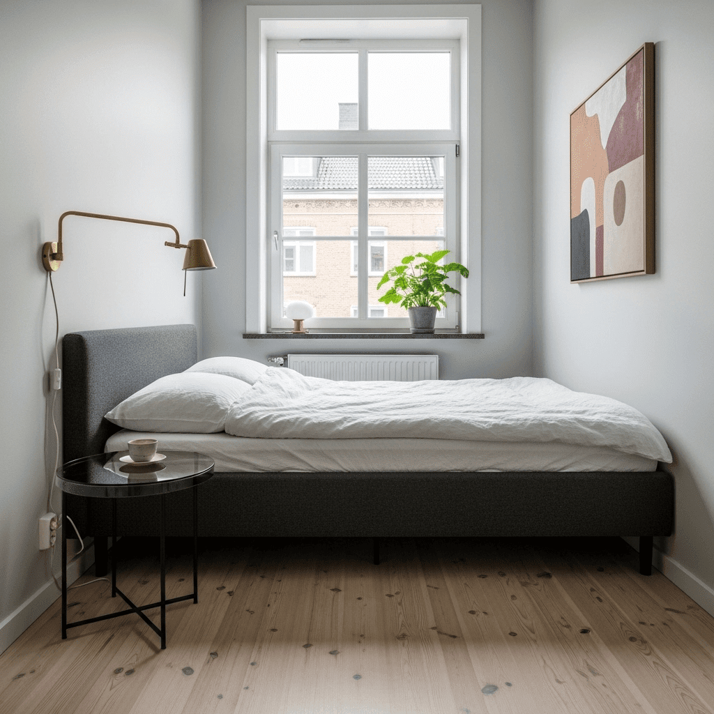 Modern bedroom ideas for small rooms men avoid small decor, opting instead for one large-scale piece of photography. A single black-and-white architectural or landscape print creates a powerful focal point that anchors the small space.