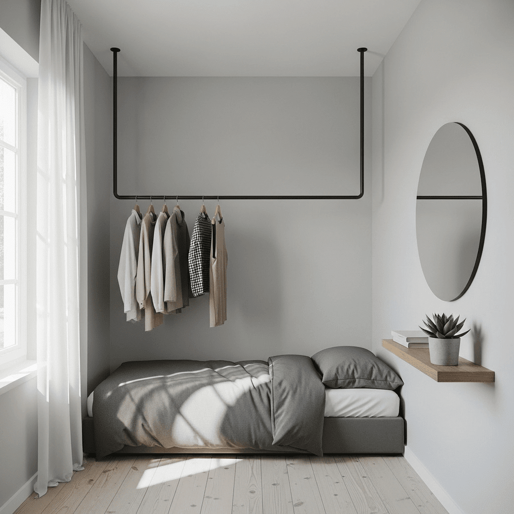 Modern bedroom ideas for small rooms men replace bulky wooden closets with an industrial-style open rail. Displaying a curated selection of jackets and shirts on matching black hangers turns a wardrobe into an architectural design feature.