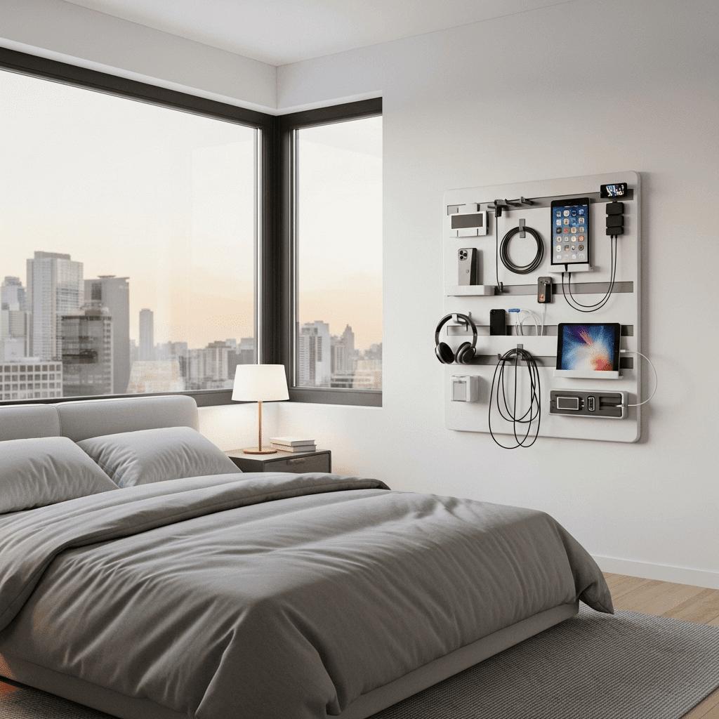 Modern bedroom ideas for small rooms men use wall-mounted organizers to dock laptops, tablets, and headphones. Moving these devices off the desk or nightstand and onto the wall maintains a “clutter-free” minimalist aesthetic.