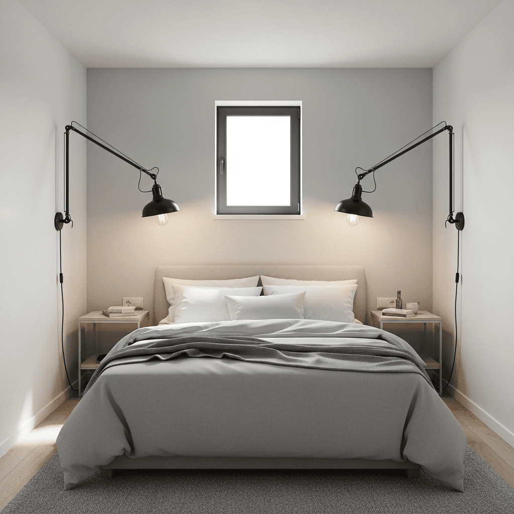 Modern bedroom ideas for small rooms men use matte black or brass “swing-arm” sconces. Mounting these to the wall frees up the nightstand for essentials and provides a sharp, masculine look to the bedding area.