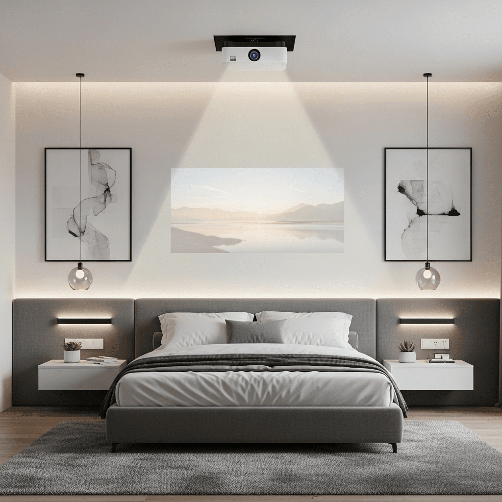 Modern bedroom ideas for small rooms men replace a bulky TV with a ceiling-mounted projector. This allows for a “big screen” experience that rolls away completely, leaving the wall clean and the room feeling more open during the day.