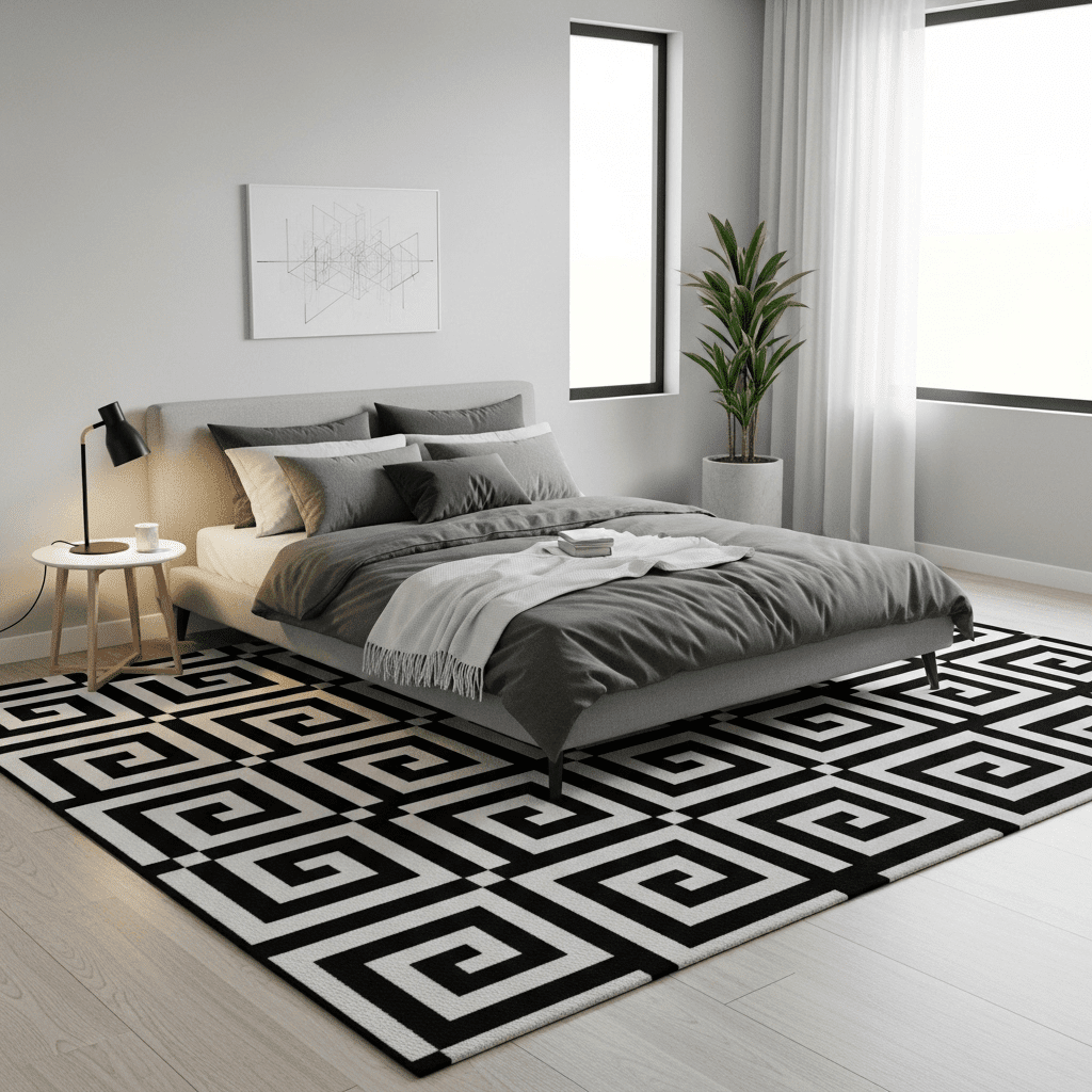 Modern bedroom ideas for small rooms men use a bold, geometric rug to define the space. A monochrome pattern in black and white adds visual interest and “stretches” the floor area through a repeat pattern.