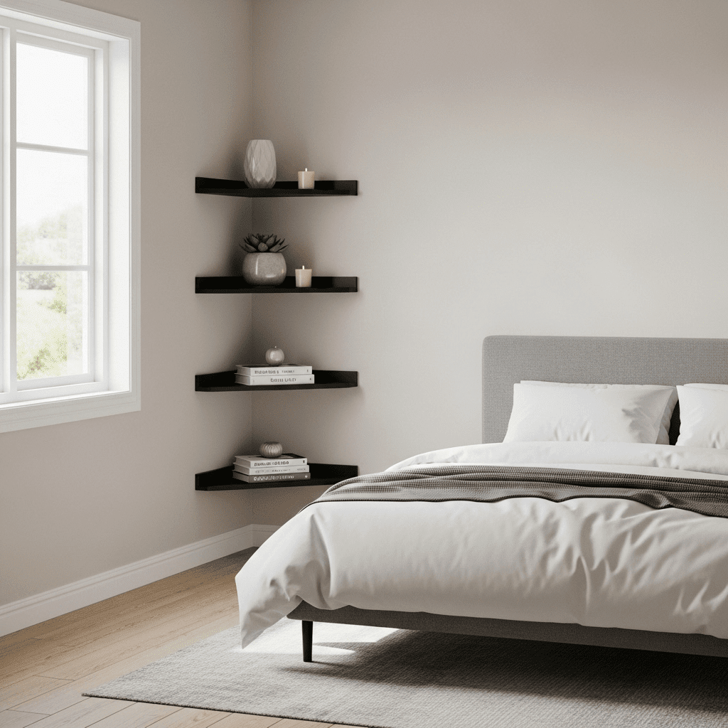 Modern bedroom ideas for small rooms men utilize unused corners for minimalist floating shelves. This is the perfect spot for displaying a few high-quality items—like a vintage camera or a watch box—without using a bulky dresser.